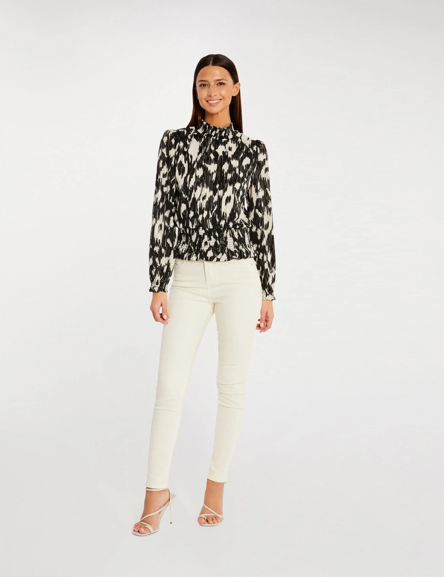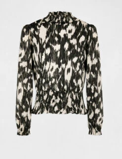 DĂ©tails plissĂ©s sur le buste, sur les manches et Ă l’encolure